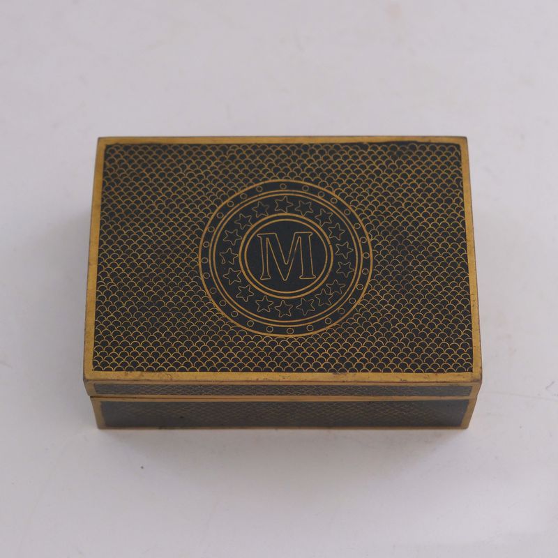 Cloisonné enamel box bearing the initial M on its lid. The box is lined in wood veneers and would probably have been made for cigarettes originally.
