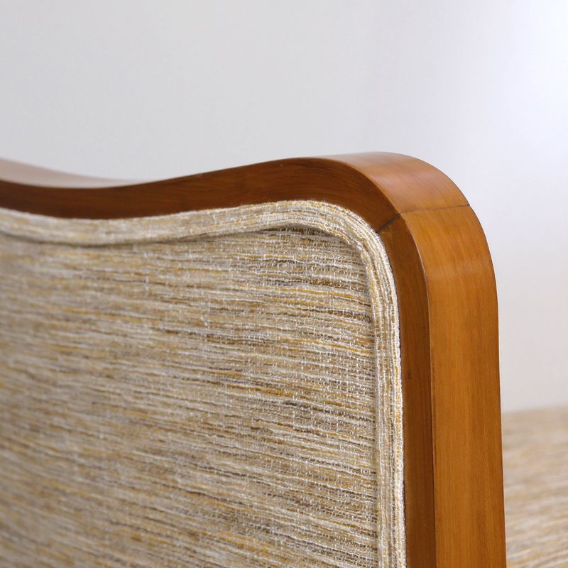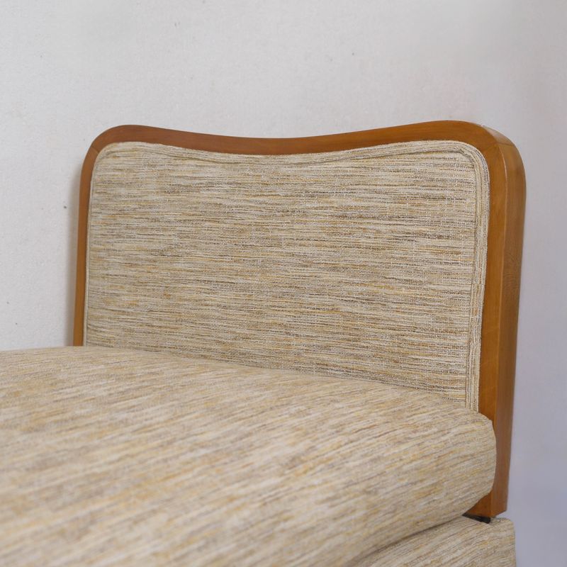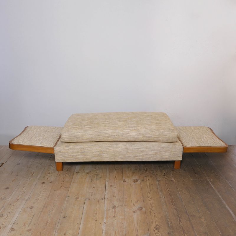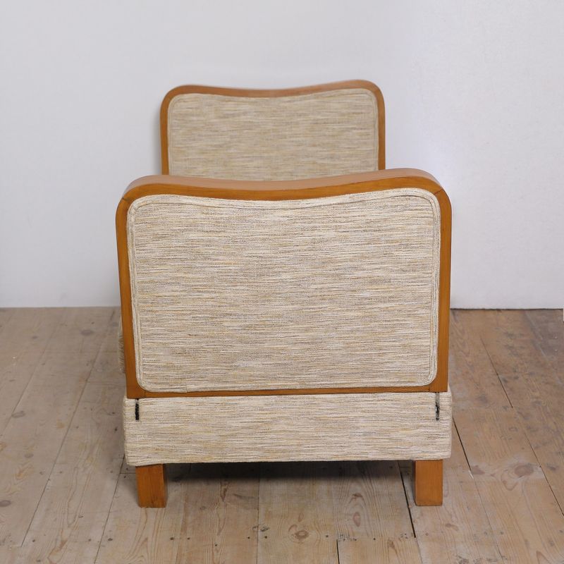 Compact daybed with wavy frames around the arms reminiscent of a larger daybed designed by Jean Royère in 1946 (see third picture, courtesy of Sotheby’s Paris, 2023).