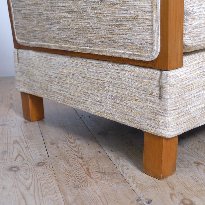 Both arms drop to allow the sitter to recline. Recently reupholstered in a warm neutral, textured fabric.