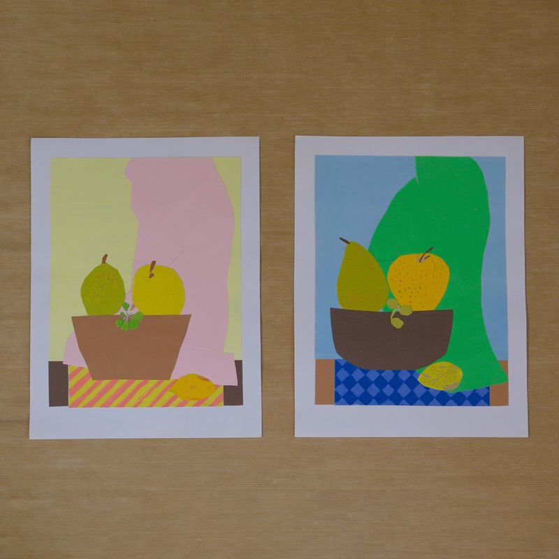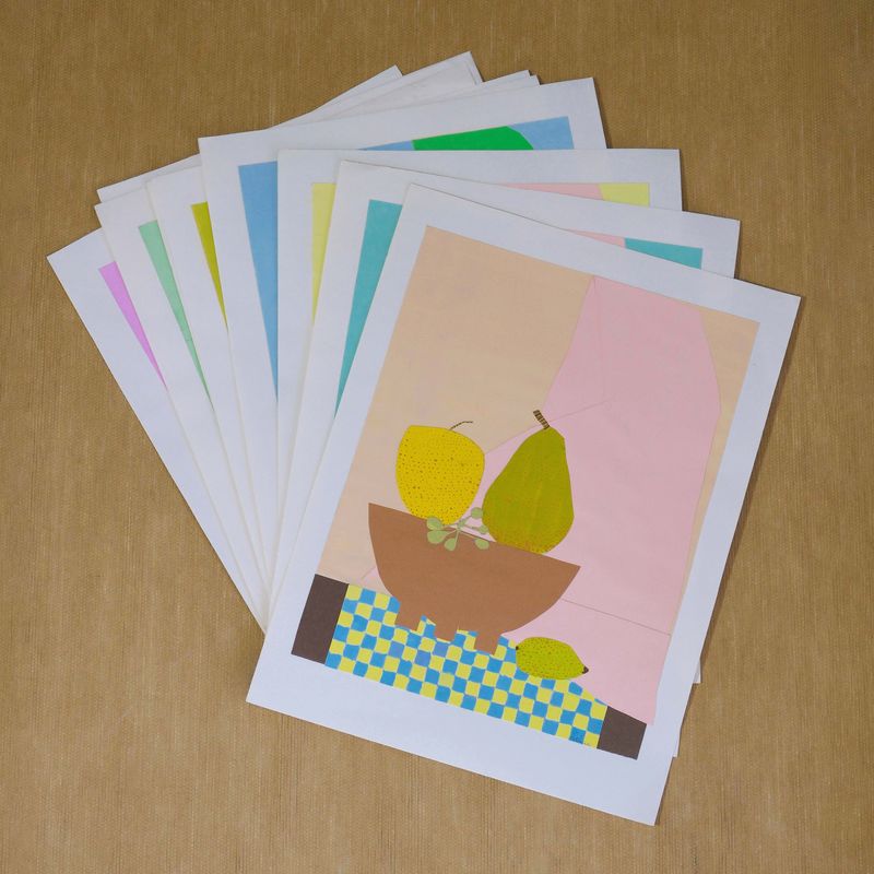 A set of 9x collages representing still lives of fruits in a bowl on a checked table cloth. Colour paper enhanced with gouache, sold unframed.