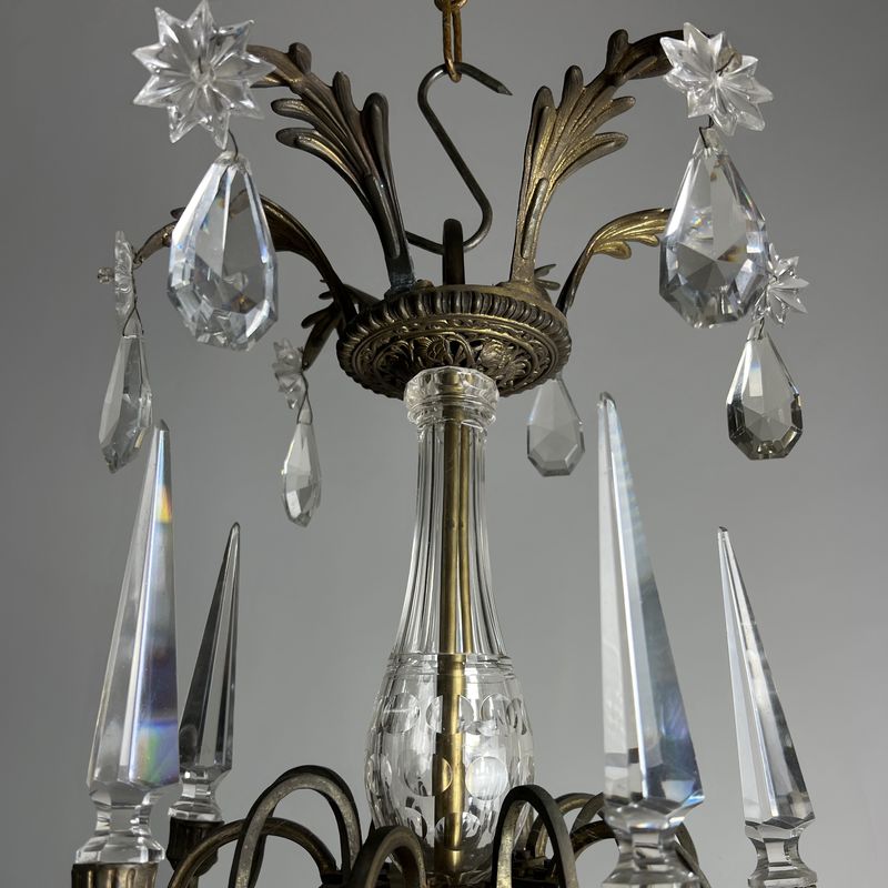 An elegant early 20th Century French chandelier with crisp cut glass crystal obelisks and flat cut glass pear-shaped drops joined with faceted beaded swags, headed with cut glass stars, terminating with a quality faceted glass ball finial.