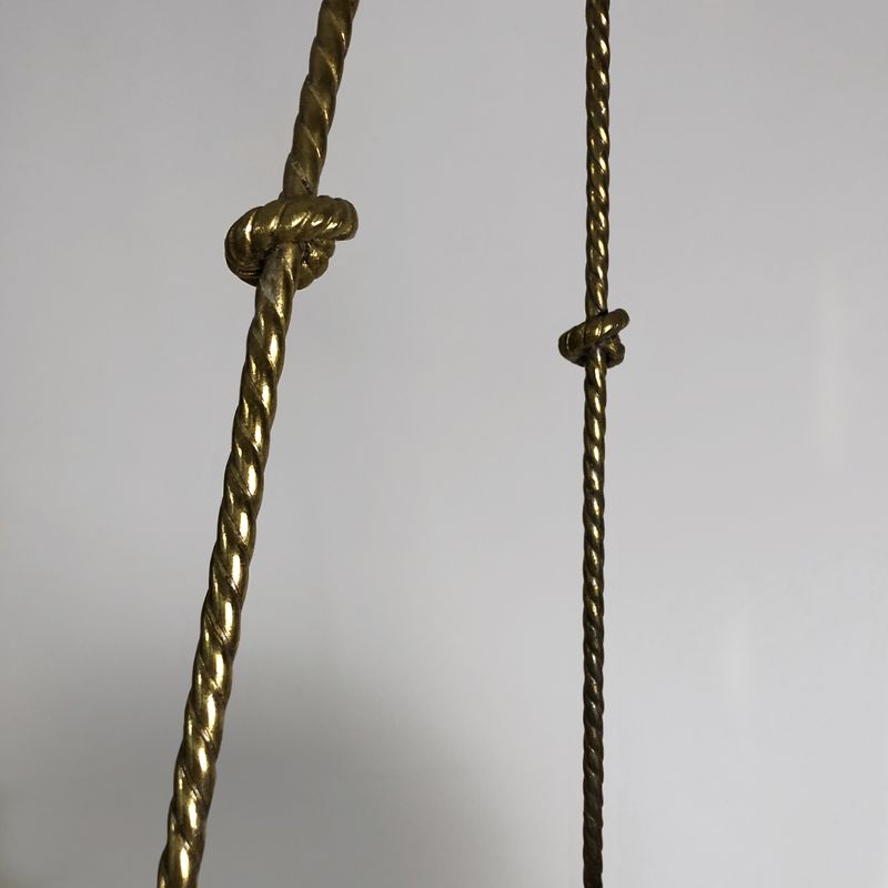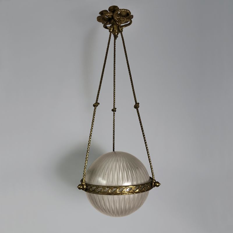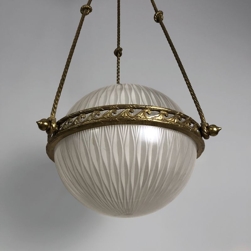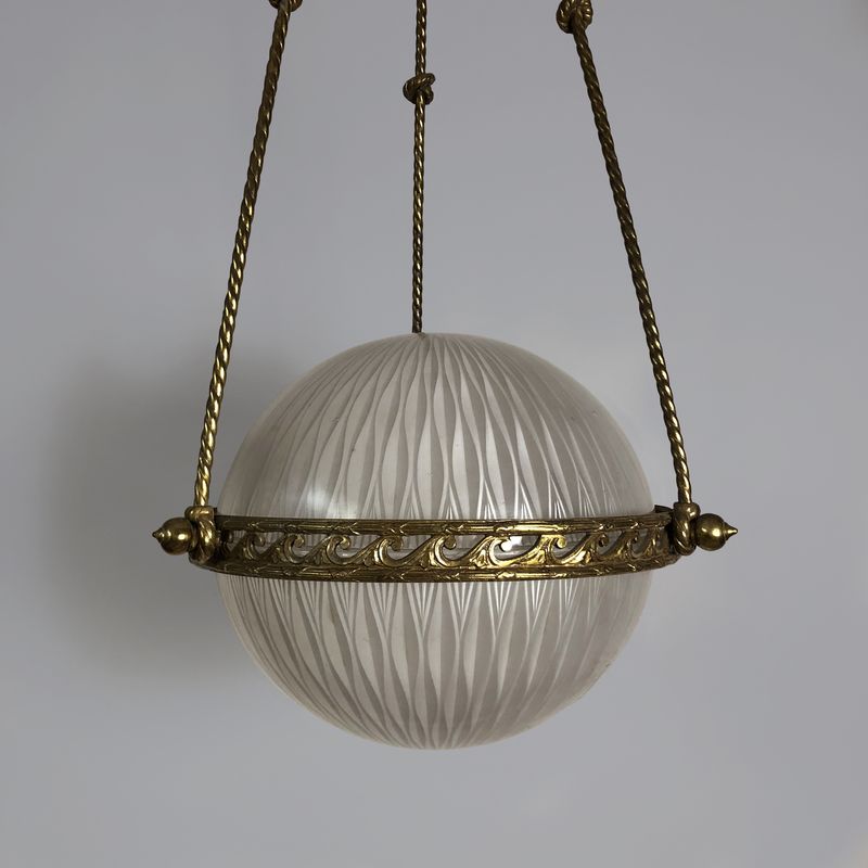 A very smart English 1920s globe pendant light suspended on three twisted brass rods in the form of ropes tied with knots. The central brass rim decorated with Vitruvian scrolls. The two-part glass shades are in perfect condition with a very subtle all-over decoration. A highly decorative and unusual globe lantern.