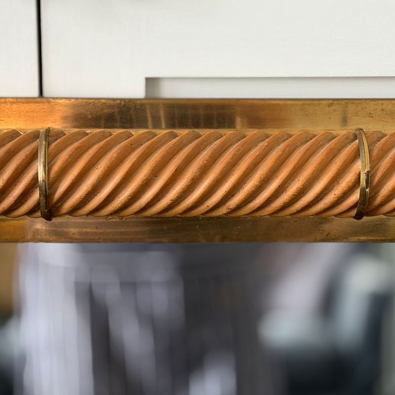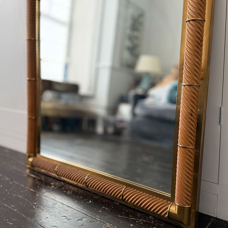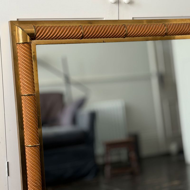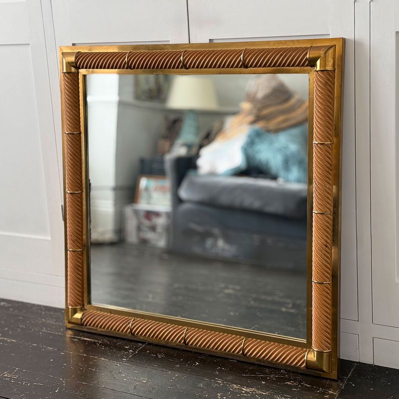 A 1970's French mirror with square spiral carved frame and brass plated bands and corners.