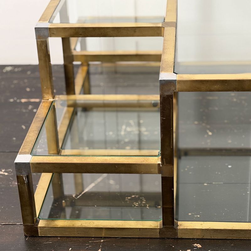 A substantial brass-plated coffee table with small nickel accents. With two tiers and 14 glass shelves set at various levels. The central, larger glass section with a matching lower shelf.