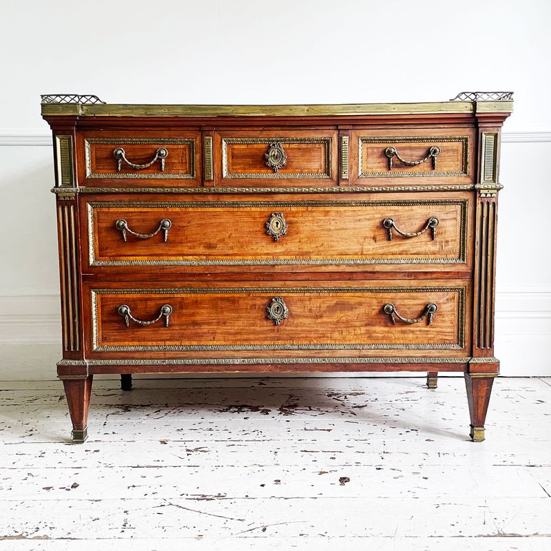 A fine and unusual Louis XVI mahogany and brass mounted commode. The three quarters cross trellis gallery enclosing a fine marble top above three short and two long mahogany lined drawers each with delicate swag drop handles, outlined with leaf cast mouldings, flanked by blind flutes of concave brass, headed by rectangular match striker panels above guttae. The square tapering legs with moulded brass sabots. Although made of fine mahogany the appearance and colour are more of a soft satinwood (or Lemonwood as its known in France).
