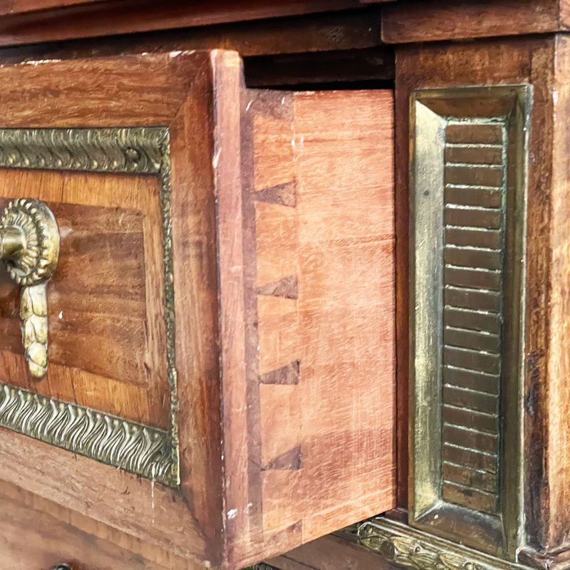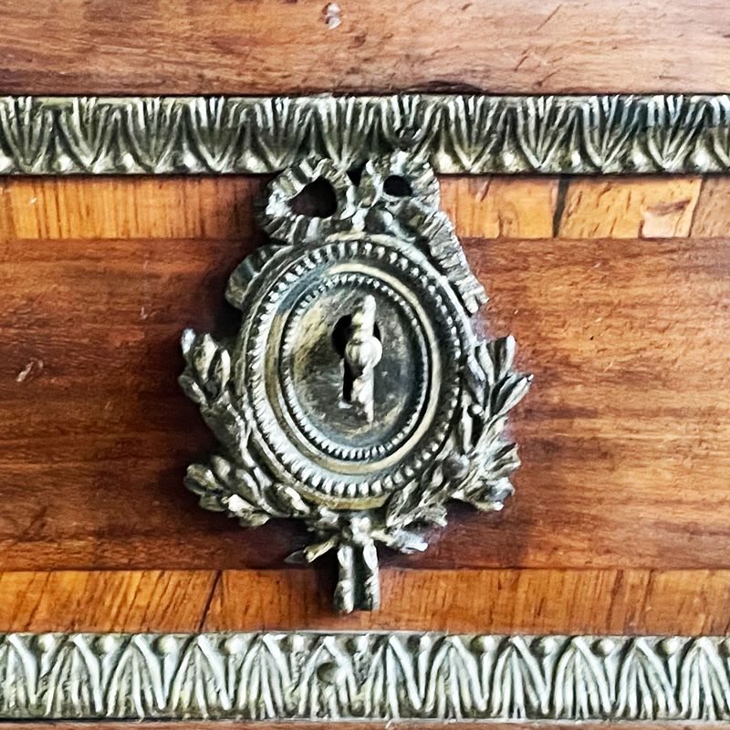 The use of mahogany as a drawer lining and the quality of the dovetails might indicate that this piece was the product of an English craftsman working in France during the late 18th century.