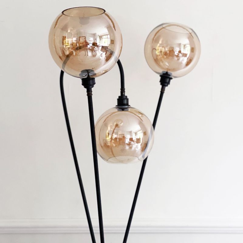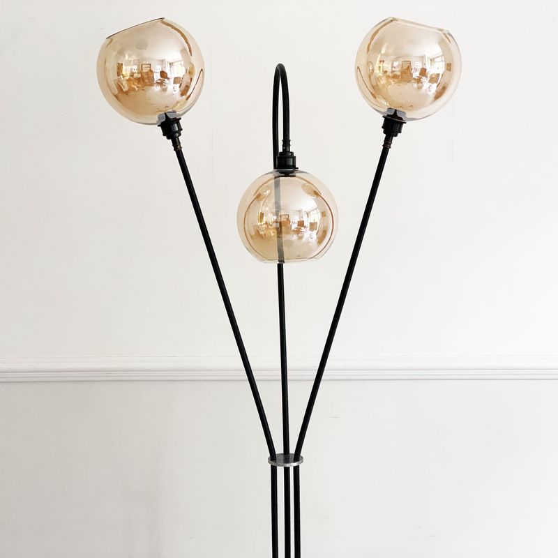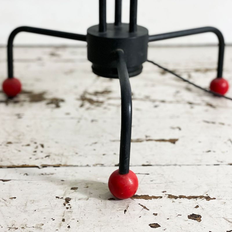 An 1950's French standing lamp with three stems and each adorned with a new amber glass globe, all sitting upon a wonderful black atomic tripod base with red ball feet. Rewired & PAT tested.