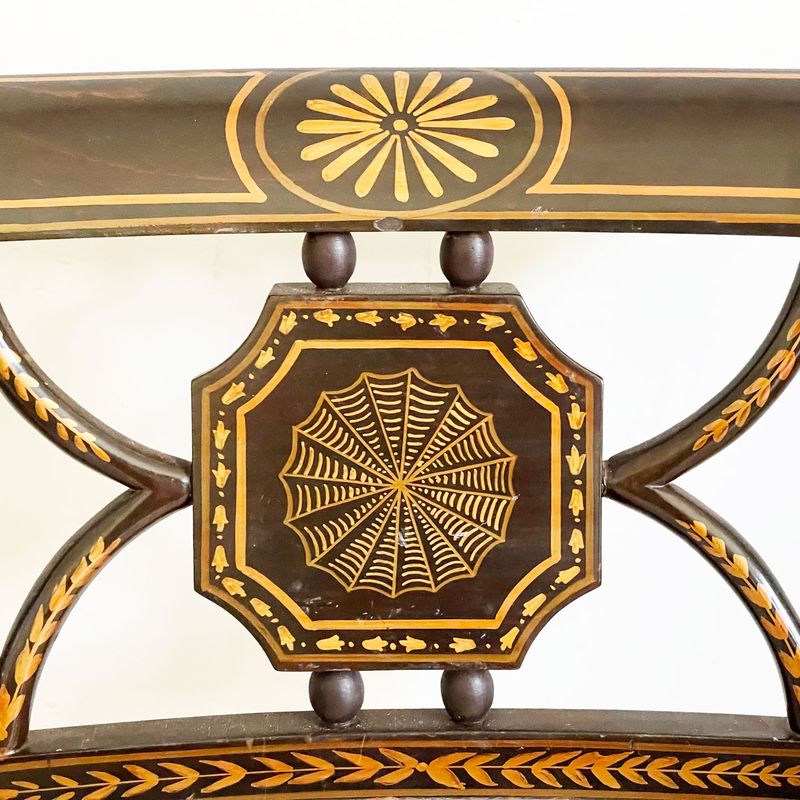 A set Regency style mid century Spanish armchairs with ornately painted decoration. Newly upholstered in antique linen.