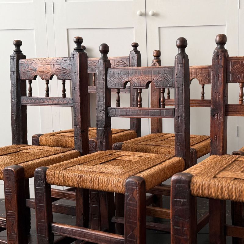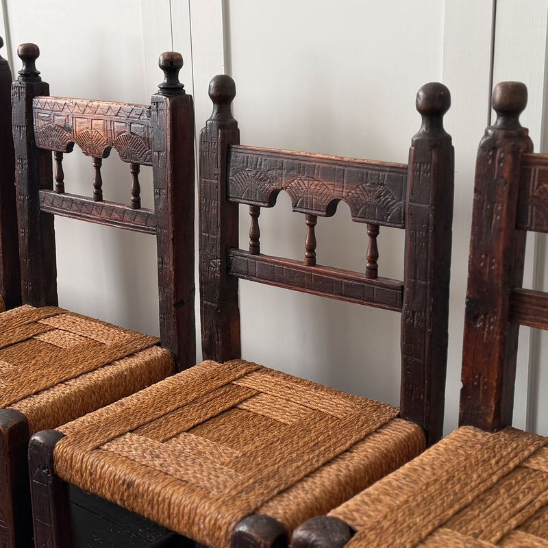 A Set of Six Antique Carved Folk Art Pyrenean Chairs with Woven Seats