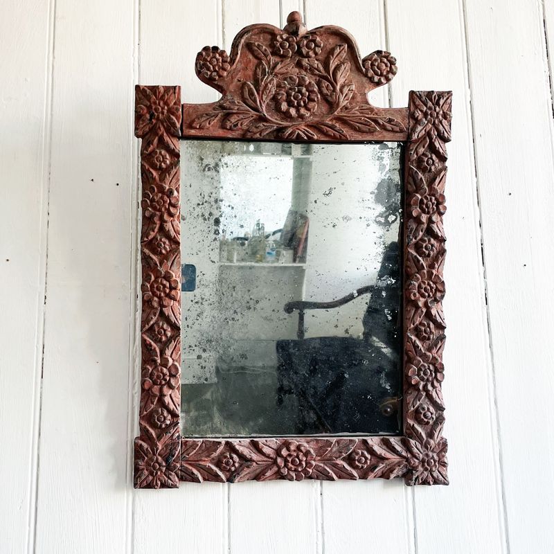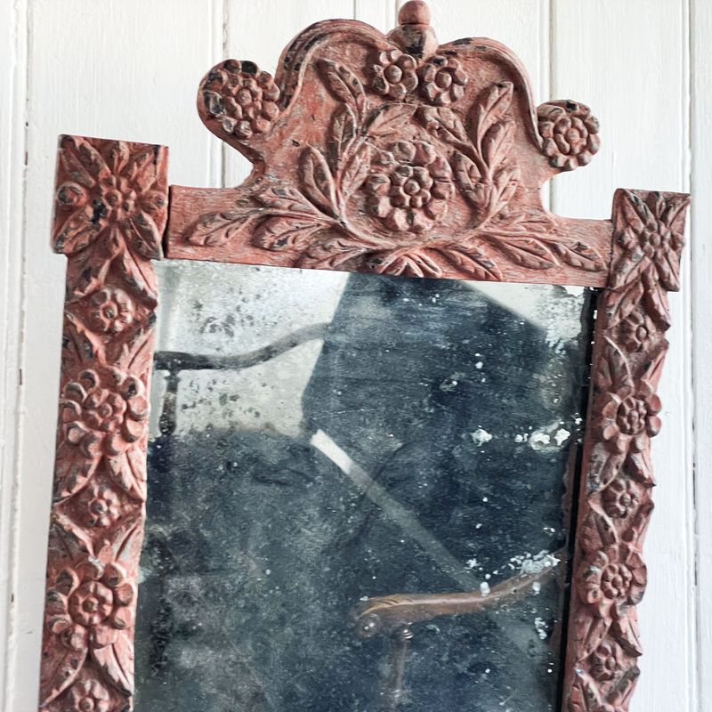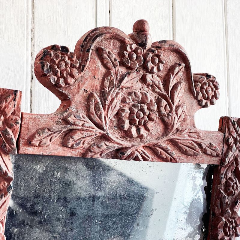 A faded red Provencal mirror with intricately carved flowers and foliage. The mercury mirror plate is nicely aged.