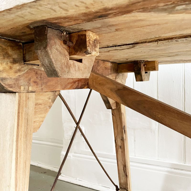 A wonderfully characterful fruitwood table, skilfully made using applewood by a French artisan. This highly adaptable table, when open, is almost three metres long and could seat up to 12 people, it can also be easily folded to a smaller, 6 seater size. The construction is ingenious, with drawing leaf sliders as well as iron bars which can be shown either decoratively or to give additional support to each end. Many years of use has given this table a lovely natural bleached look.