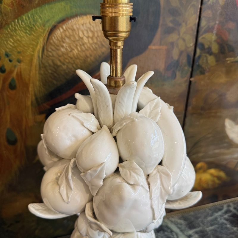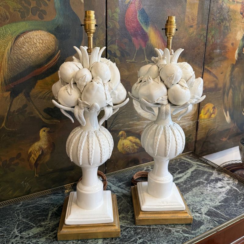 A large pair of off-white Spanish pottery lamps, the central stem topped with an elaborate fruit basket.