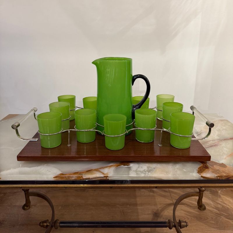 An unusual French art deco lemonade set comprising large jug and 12 glasses. The tray with chrome mounted holders, glass and chrome handles.