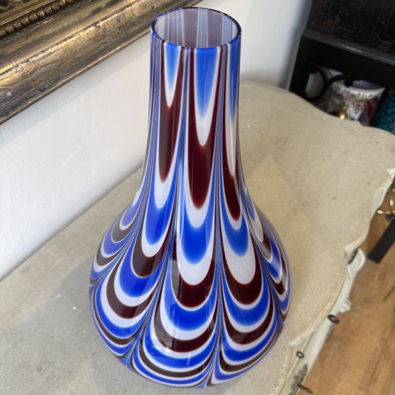 A large and impressive Murano glass vase with swirls in blue, red and white.