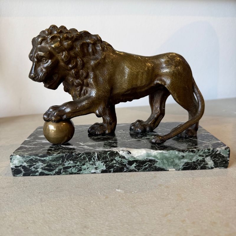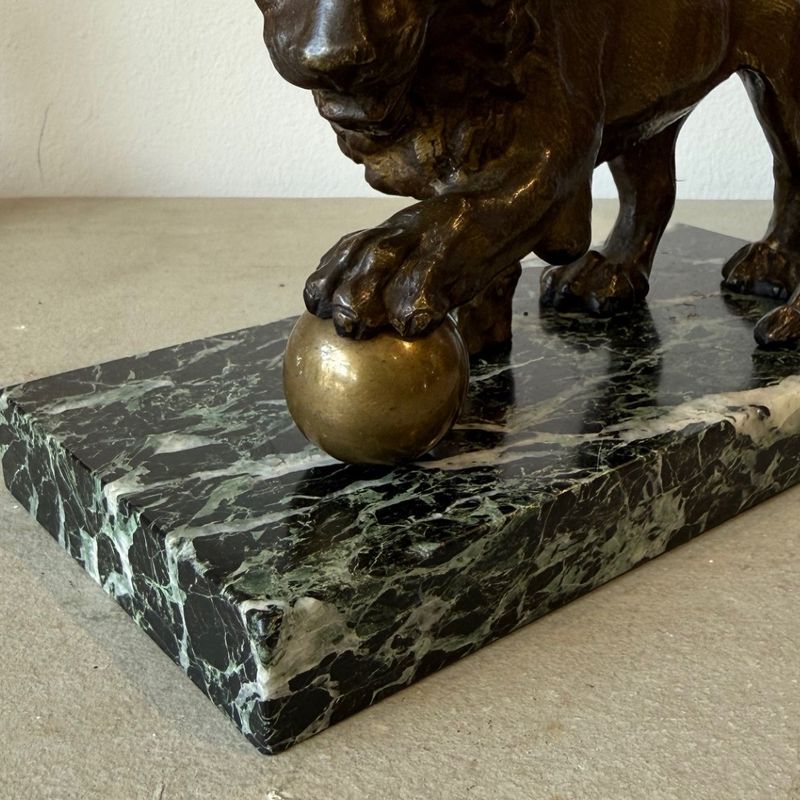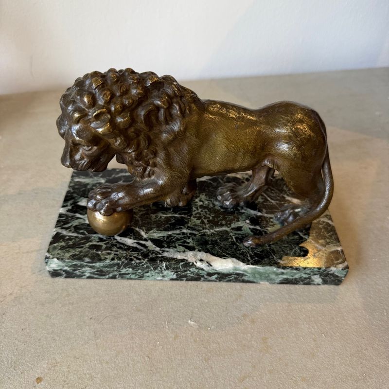 19th Century bronze medici lion mounted on a green marble base.